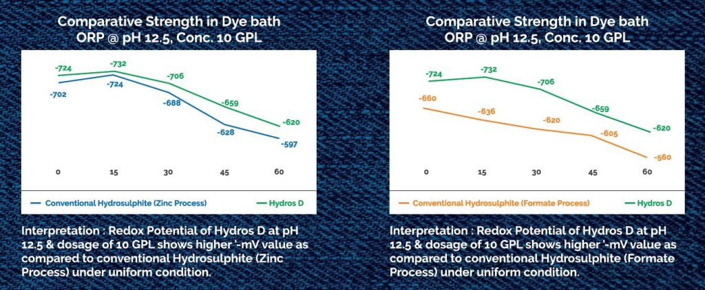 - Gives Alkaline reaction in dyebath offering Higher Free ‘Dithiionite Ion’ in dyebath at all times when compared to Sodium Formate route Sodium Hydrosulfite.